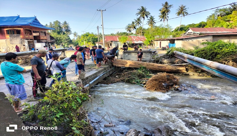 Mukramin menjelaskan bahwa hujan lebat selama dua jam menyebabkan debit air meningkat dan membawa material kayu serta bebatuan dari hulu, sehingga beberapa sungai meluap