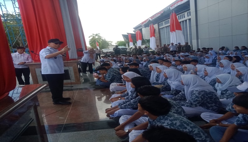 TOPIKSULTRA.COM, KENDARI — Gubernur Sulawesi Tenggara (Sultra), Mayjen TNI (Purn) Andi Sumangerukka, Menyapaikan pesan dan motivasi pada 378 Pelajar SMA Negeri 12 Kendari saat apel pagi di Kantor Gubernur Sultra.