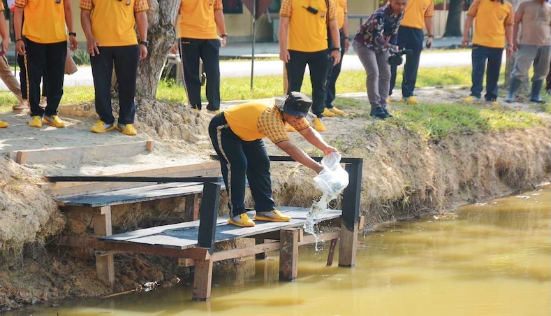 TOPIKSULTRA.COM, KONAWE — Kepolisian Daerah (Polda) Sulawesi Tenggara tebar 1000 ekor benih ikan dan dirangkaikan dengan penanaman bibit tanaman pangan di Sekolah Polisi Negara (SPN) Polda Sultra, Kabupaten Konawe, pada Jumat, (1/10/2024)