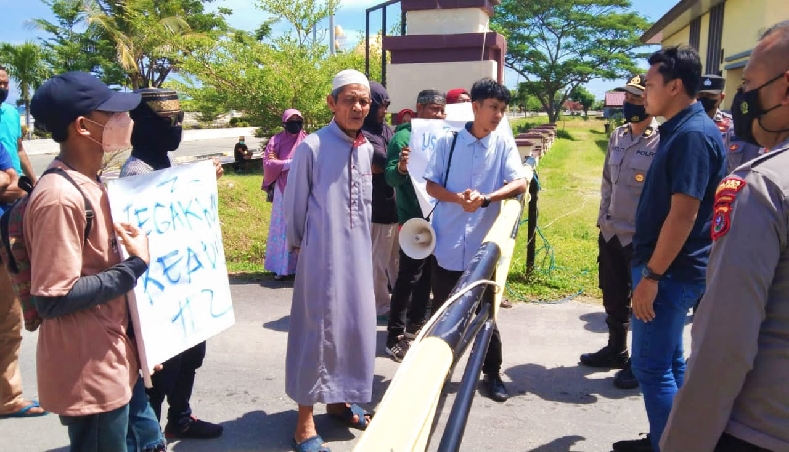 TOPIKSULTRA.COM, KENDARI — Puluhan masyarakat Desa Tambuha, Kecamatan Watunohu, Kabupaten Kolaka Utara, Provinsi Sulawesi Tenggara demonstrasi di depan Mako Polres Kolaka Utara pada Rabu (20/4/2022).