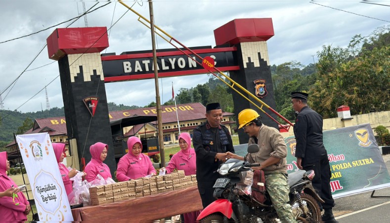 TOPIKSULTRA.COM, KOLAKA UTARA — Menjelang waktu berbuka puasa, personel Batalyon C Pelopor Satbrimob Polda Sulawesi Tenggara yang bermarkas di Desa Totallang, Kecamatan Lasusua, menggelar pembagian takjil gratis kepada masyarakat Kabupaten Kolaka Utara. Kegiatan ini bertujuan mempererat silaturahmi dengan warga serta para pengendara roda dua dan roda empat yang melintas di bulan suci Ramadan 1447 Hijriah.