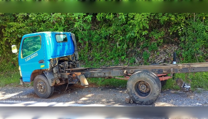 Saat ini, kendaraan sudah tidak lagi utuh. Pelat nomor tidak ditemukan, sementara stiker identitas perusahaan yang berada di dalam kabin sopir terlihat rusak dan sebagian sobek sehingga tidak dapat terbaca dengan jelas.